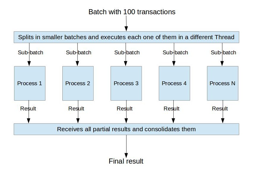 The parallel implementation is somewhat more complex. The idea is to split the main transactions batch into smaller batches, then to execute each one of these batches in different Threads, get the partial result of the processing for each batch and, finally, compute the final result over this data. The picture bellow illustrates this idea.
