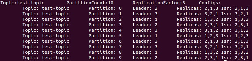 # 1 - Starts a second broker docker-compose --project-name test -f docker-compose-kafkatest.yml run -e KAFKA_BROKER_ID=2 --name=test_kafka_2 -p 9092 -d kafka # 2- Starts a third broker docker-compose --project-name test -f docker-compose-kafkatest.yml run -e KAFKA_BROKER_ID=3 --name=test_kafka_3 -p 9092 -d kafka # 3 - Creates a topic with replication factor 3 split among 10 partitions docker exec -it test_kafka_1 /opt/kafka_2.11-0.10.0.0/bin/kafka-topics.sh --create --zookeeper zookeeper:2181 --replication-factor 3 --partitions 10 --topic test-topic # 4 - Lists how partitions are balanced across the 3 brokers of the cluster docker exec -it test_kafka_1 /opt/kafka_2.11-0.10.0.0/bin/kafka-topics.sh --describe --zookeeper zookeeper:2181 --topic test-topic